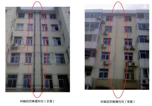該房為中間設(shè)有10CM沉降縫的4單元6層筏板基礎(chǔ)、磚混結(jié)構(gòu)房。因沉降縫處有暗浜而發(fā)生不均勻沉降,結(jié)果屋頂沉降縫處相碰觸,4、5、6樓均出現(xiàn)裂縫。經(jīng)糾偏后房屋回傾脫開,恢復(fù)正常。